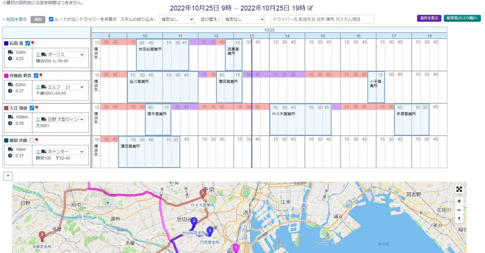 ODINではそのルートの総距離、総時間が見える化できるため、誰が見ても無理のない配車になります。