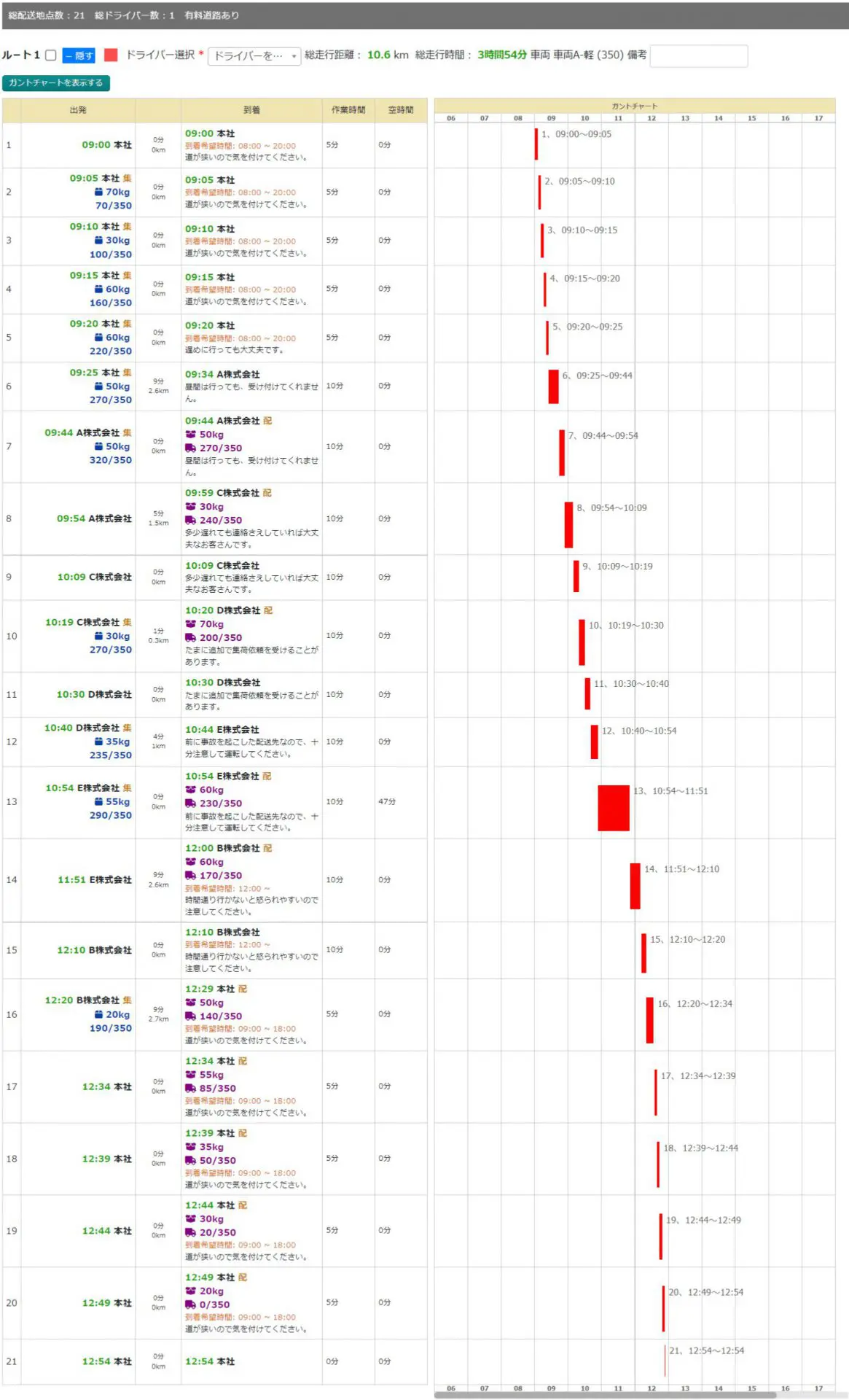 計画を見て分かる通り、荷物量や到着希望時間を考慮した計画が作成されます。