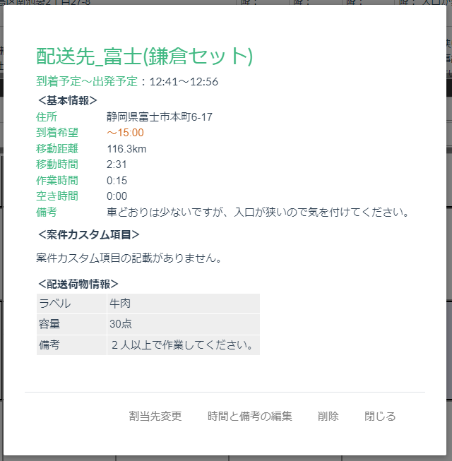 - 割り当て済みの集荷配送の片方をルートから削除すると紐づいている片割れも削除され、集荷先と配送先のペアとして、未割当の配送指示になります。(この際、荷物情報は消失します)