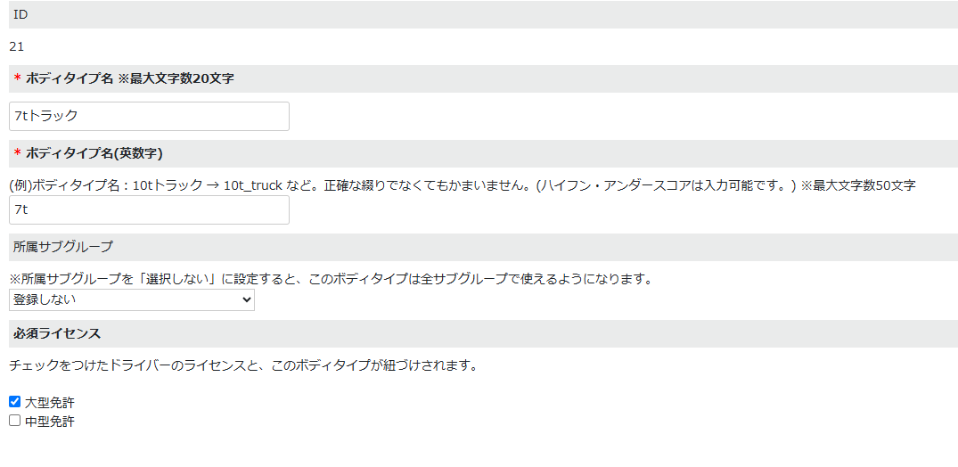 ④ボディタイプにはライセンスを紐づけることができます。当該のボディタイプを使用するために必要なライセンスを選択して登録することが可能です。※ライセンスとの紐づけをしないと、自動でドライバーと車両のマッチングができません。手動では紐づけ可能です。
