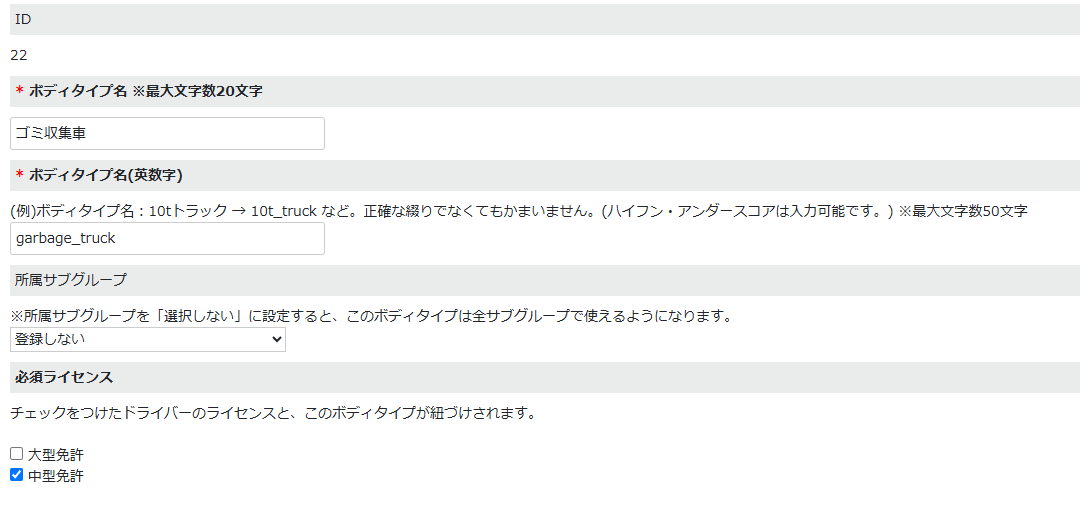 ③「ボディタイプ名」と「ボディタイプ名(英数字)」、「所属サブグループ」を登録します。※所属サブグループを「登録しない」で登録すると、全サブグループで使用できるボディタイプとして登録されます。