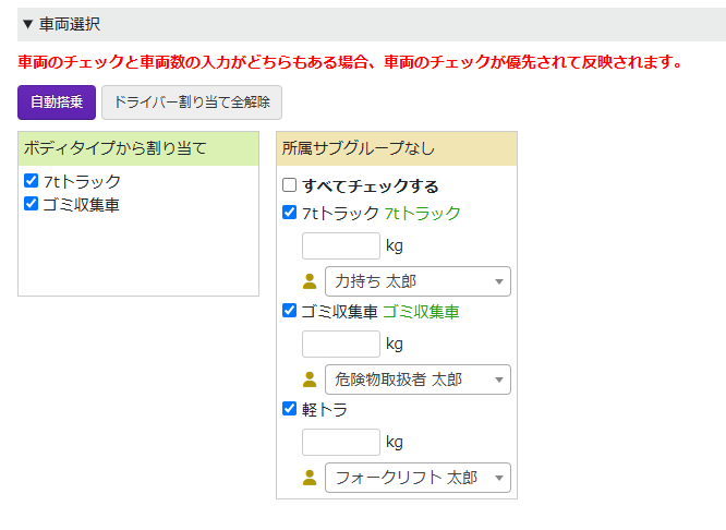 ※配送先の必須スキルにスキルとボディタイプの2種類とも設定している場合は、車両選択の設定時にドライバーと車両を手動または自動でマッチングさせる必要があります。