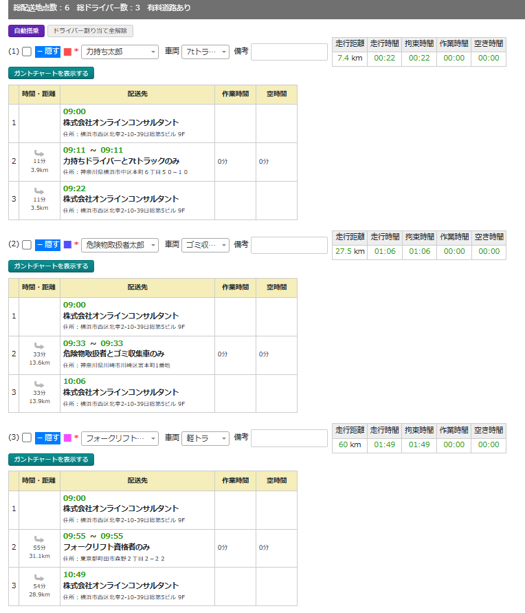 その後配送計画を作成すると、自動的にドライバーと車両が振り分けられ、配送先の必須スキルに対応した、ドライバ、車両を考慮したルートの作成が可能です。。