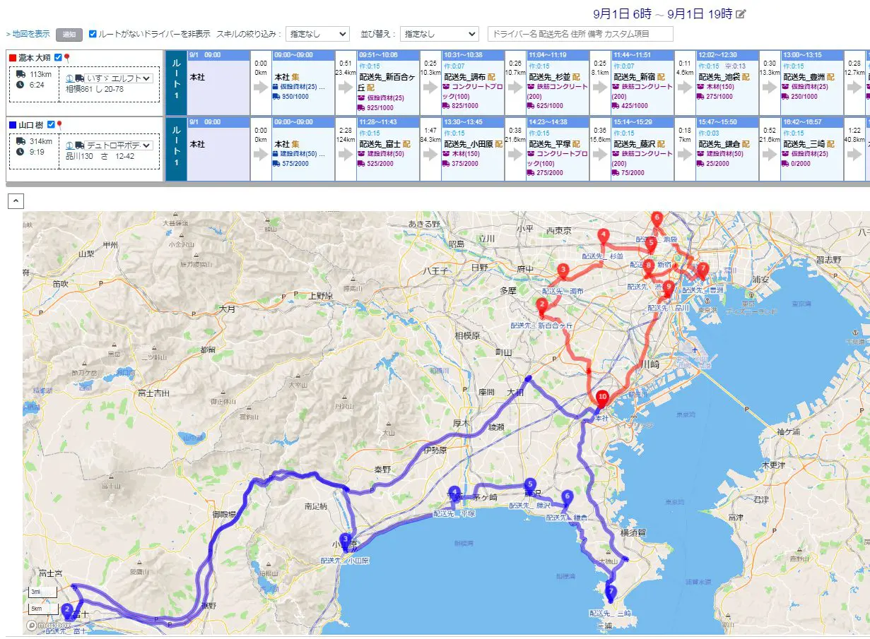 ・ 1回の配送計画計算に設定してある配送指示の中で、同じ配送先に行く配送指示があればそれらを1つにまとめます。