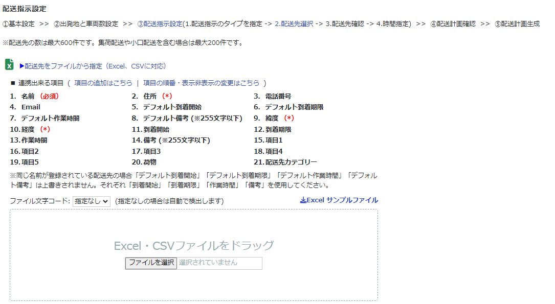 (管理画面左上のメニュー > 配送先 > 配送先新規追加 > CSV一括登録 > 緯度・経度の情報もお持ちの方)